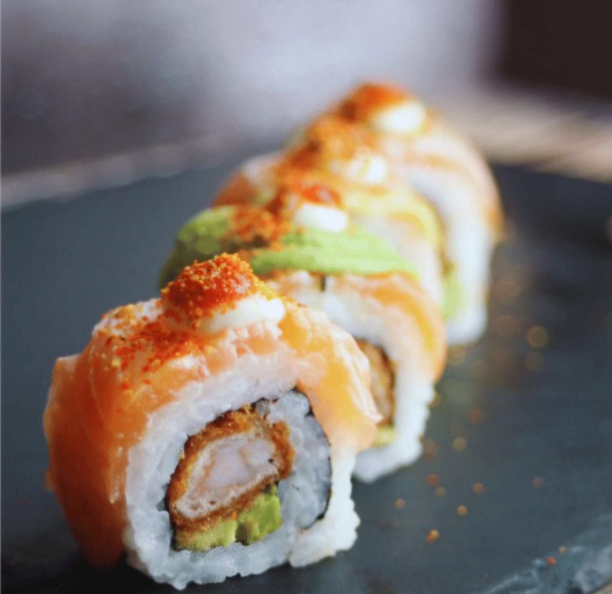 Seared Scottish salmon, avocado, & prawn tempura topped with mayo & sriracha – roarsome! Please note that this is a half roll with 4 pieces.